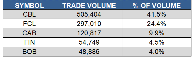 The top five share volume leaders on BISX for the three-month period April 1, 2018 to June 29, 2018 with their contribution to total traded volume displayed as a percentage were: