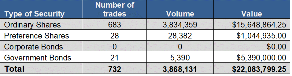 As at June 29, 2018 the market was comprised of 19 ordinary shares with a market capitalization of $4.162 Billion. In addition, there were 13 preference shares with a market capitalization of $327.25 Million and 19 bonds with a face value of $579 Million.