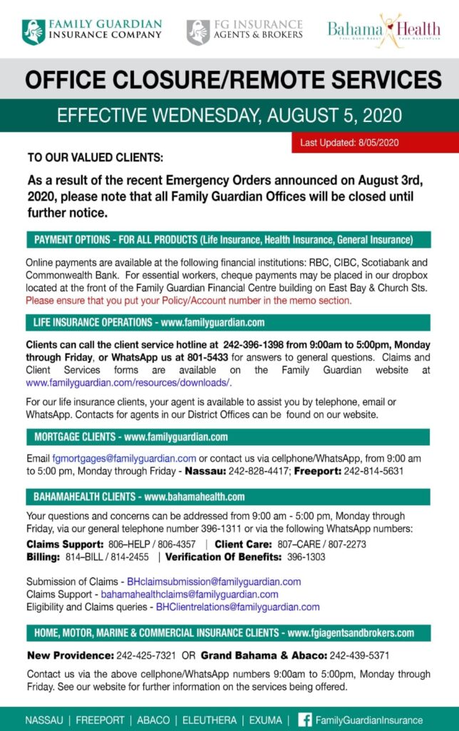 Please be advised that as a result of the recent Emergency Orders announced on August 3, 2020, please note that all Family Guardian offices will be closed until further notice. The Notices can be found in the News Section of FamGuard Corporation on the website.